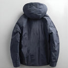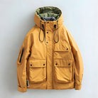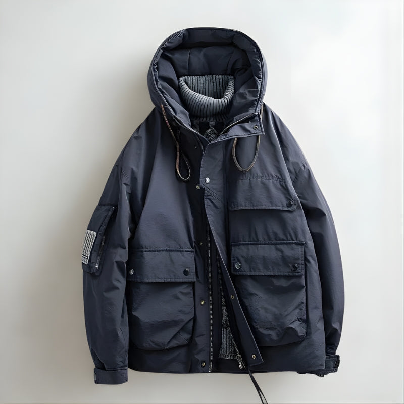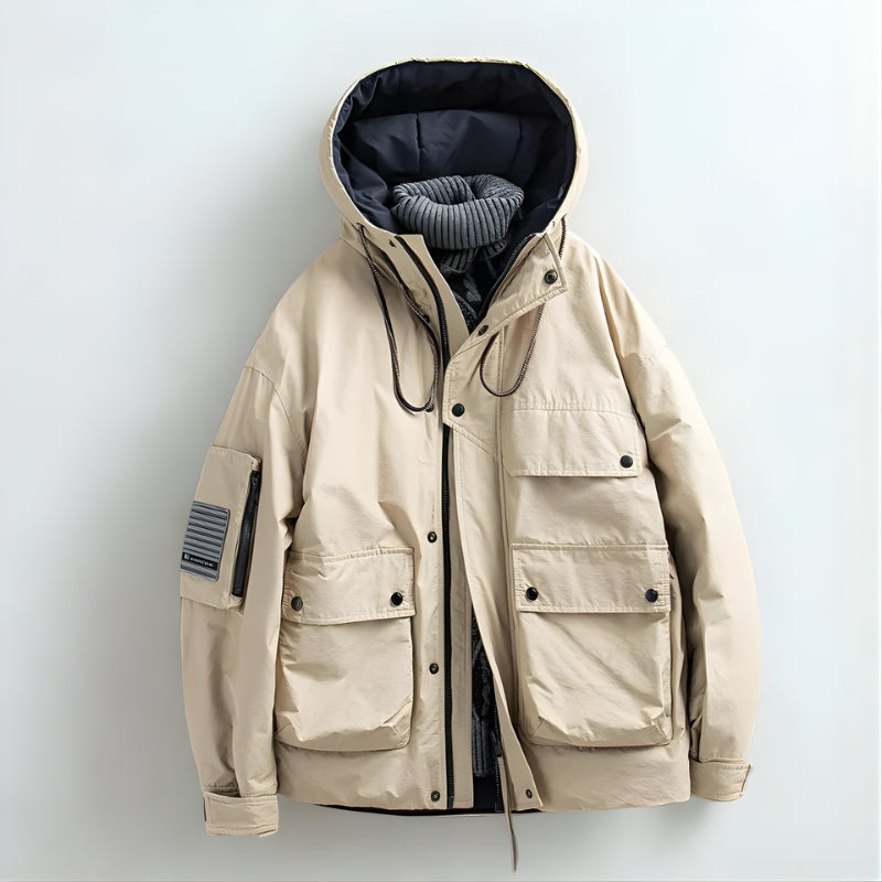 This hooded jacket combines a structured exterior with a inner lining for balanced warmth and coverage. The design includes multiple front pockets, an adjustable hood with drawcords, and a full front closure secured by snaps and a zipper.