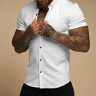This stylish short-sleeved shirt blends modern design with everyday comfort. It offers a sleek fit while allowing ease of movement. The button-up style ensures a polished look, making it a versatile choice for both casual and smart occasions.