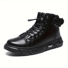 These high-top trainers feature a leather upper and a rubber sole. The design includes laces and a back buckle detail. The sole provides grip and stability. The cut reaches above the ankle. Suitable for casual wear. Can be paired with jeans, jackets, or hoodies.