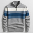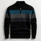 This quarter-zip pullover presents a modern striped pattern across the chest and sleeves, offering a structured yet relaxed appearance. The ribbed collar, cuffs, and hem provide a neat outline that maintains shape through wear. Designed with a short front zipper, it allows adjustment for temperature and style preference.