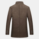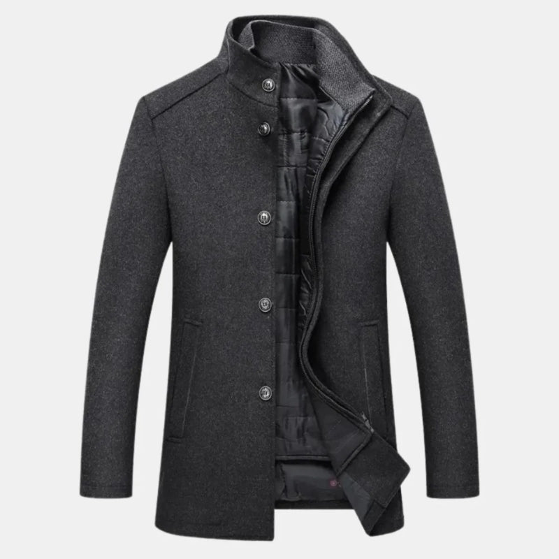 This men’s overcoat combines a classic outline with a practical inner lining for added warmth and coverage. The stand collar and full button closure bring a refined structure to the design, ideal for colder days or smart occasions. Two side pockets allow for convenient storage without disrupting the streamlined shape.