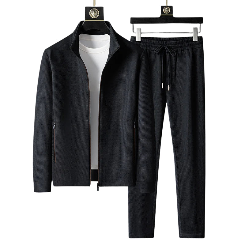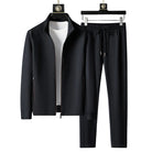 This men’s tracksuit set includes a zip-front jacket and matching joggers designed for a streamlined silhouette. The jacket features a stand collar, long sleeves, and side pockets with concealed zippers. The joggers are styled with an elastic waistband and adjustable drawstring, ensuring a personalized fit.
