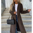 A women’s long coat with a two-row button front, notched collar, and a matching belt to shape the waist. The solid colour and full-length sleeves create a clean winter profile with added coverage. Side pockets keep small items close at hand. Suited to office days, dinners, and city commutes through autumn and winter.