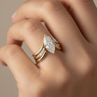 This ring presents a marquise-shaped center stone set on a gold-plated tone band, paired with side accents for added structure. The layered band design offers a refined silhouette that pairs well with various jewelry styles. It can be worn during celebrations, evenings out, or as a standout element in everyday styling.
