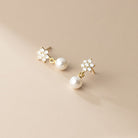 Gold-Tone Earrings with Pearl Drop and Clear Stone Flower Top