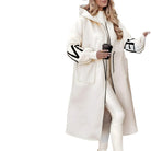 This women’s jacket has a longline cut that extends below the knees and a front zip fastening running through the centre. It is designed with an oversized hood, knitted sleeves with a patterned detail, and large front pockets.