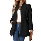 This women’s black coat brings together structure and simplicity with its straight cut and button front design. It includes long sleeves, side pockets, and a collarless neckline for a clean, modern finish. The coat’s mid-length shape makes it ideal for layering over jumpers or blouses during autumn and winter.