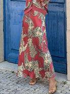 This flowing satin maxi skirt combines ease with a bold edge. Featuring a distinctive tiger print and a high-rise stretch waist, it offers ease of movement with a modern finish. The smooth fabric drapes naturally, making it ideal for warm days or layering in cooler weather. Perfect for holidays, everyday dressing, or relaxed gatherings.