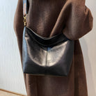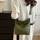 This women’s shoulder bag is designed with a spacious main compartment. It features a wide, patterned strap that can be adjusted for crossbody or over-the-shoulder wear. The bag includes gold-tone hardware and a top closure.