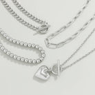 This layered necklace set combines mixed chain styles arranged in balanced tiers for a contemporary finish. Each strand fastens with a toggle clasp, while a heart-shaped pendant serves as a gentle focal detail. The varied textures create visual depth, making the piece suitable for both casual and refined outfits.
