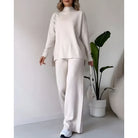 This women’s two-piece loungewear set offers a clean silhouette, ideal for everyday wear. The ribbed style adds depth to the set, while the wide-leg trousers and loose-fit top allow natural motion. The high neckline and dropped shoulders lend a refined finish.