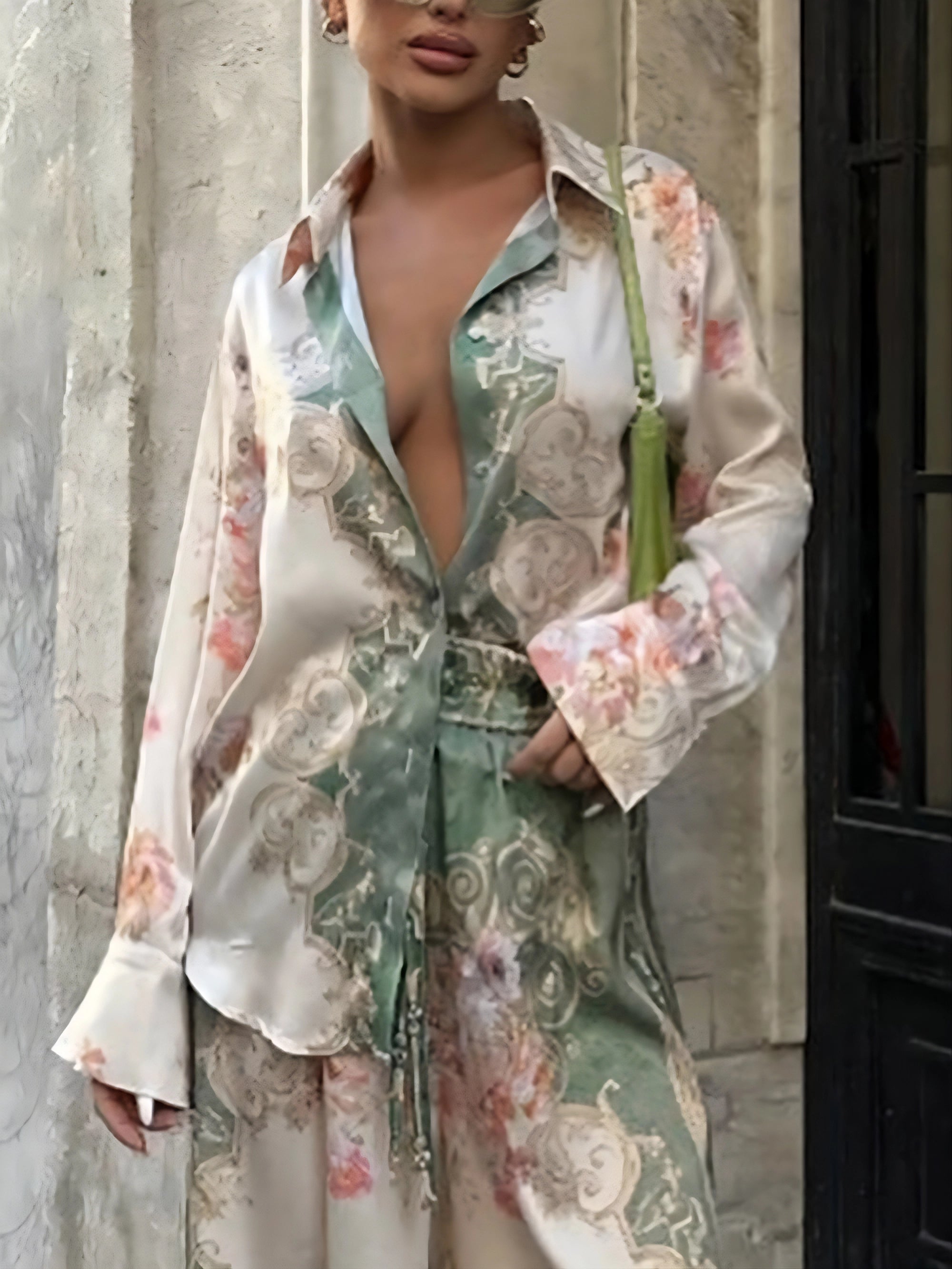 Women’s Satin Print Blouse – Unique Button-Down Oversized Fit for Modern Day-to-Evening Style