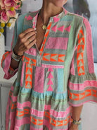 This bohemian midi dress offers relaxed elegance with a carefree charm. Featuring tiered layers and a V-slit neckline. The loose fit and wide sleeves create easy movement, while vibrant prints add artistic flair. Ideal for sunny days and laid-back occasions.