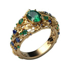 This ring is a gold-tone band shaped into a detailed vine and floral design. The centerpiece is a round green gemstone, surrounded by smaller green and blue accent stones set within sculpted leaves.