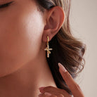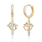 These hoop earrings paired with cross-shaped pendants arranged with clear stones. The hanging design adds a refined touch while keeping a symbolic and structured shape. Their polished finish pairs well with many styling choices, making them suitable for both day and evening moments.Â