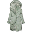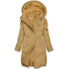 This long winter coat is defined by quilted padding arranged in even panels and finished with an adjustable hood. The zipper extends through the full length and is reinforced with snap buttons along the placket. Two large front pockets provide room for gloves or small items, while the balanced shape ensures a neat winter silhouette.
