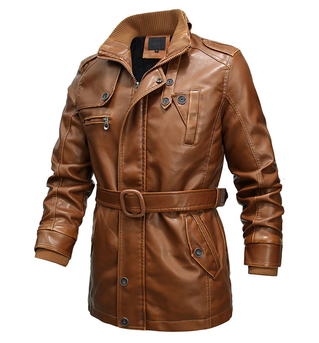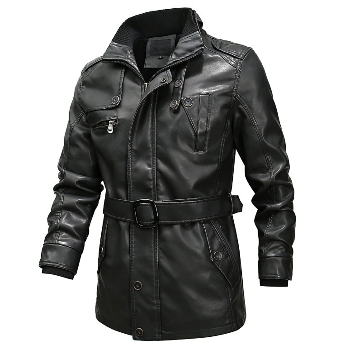 Men's Long Zipped Jacket with Stand Collar and Waist Belt
