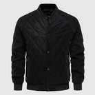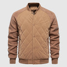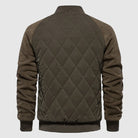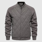 This outer layer jacket has a classic bomber silhouette. It has distinctive diamond-shaped quilted pattern across the body for insulation. The sleeves are made from a contrasting fabric, adding a modern, rugged detail. The design includes ribbed collar, cuffs, and hem.