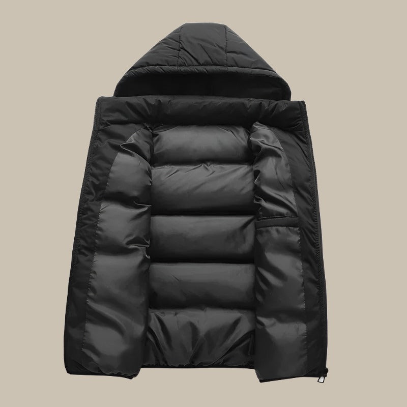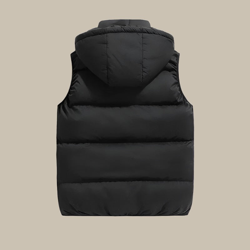 This sleeveless vest is a fitting item for added heat without bulk. The vest includes a hood for added guarding when needed. The design is fitting for cool weather when you need a top layer. It can be simply joined with sweaters or long-sleeve shirts for a neat look. This item provides a nice feel and is uncomplicated for daily use.
