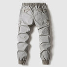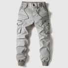 These men's trousers are styled for utility, has several pockets down the leg for keeping small items. The item closes at the waist with a button and includes a drawcord for adjusting the around the middle. The lower section of the leg tapers down and ends in a band around the ankle area. This lower body item is appropriate for wear and helps create a tidy presentation.