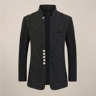 This men's jacket has a row of decorative buttons running down the centre front. The item includes a high stand-up collar that sits close to the neck. The outerwear is tailored to offer a narrow across the body. With pockets for storage, thisĀ jacket is suitable for wearing in professional settings, gatherings, or for evening occasions during the Spring and Autumn seasons.