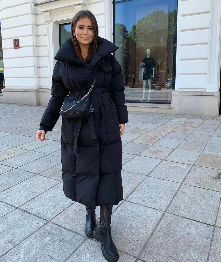 Women Long Quilted Puffer Padded Jacket with Adjustable Belt