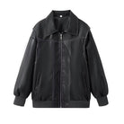 This women's jacket is styled with an oversized, boxy shape, offering a cut that sits at the hip. The item has a full front zip and prominent contrasting stitching. It includes a classic collar and wrist cuffs, making it a suitable cover-up for transitional weather.