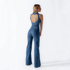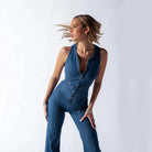 Women’s Denim Jumpsuit – Stylish Chevron Design with Heart Cut-Out Back