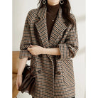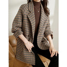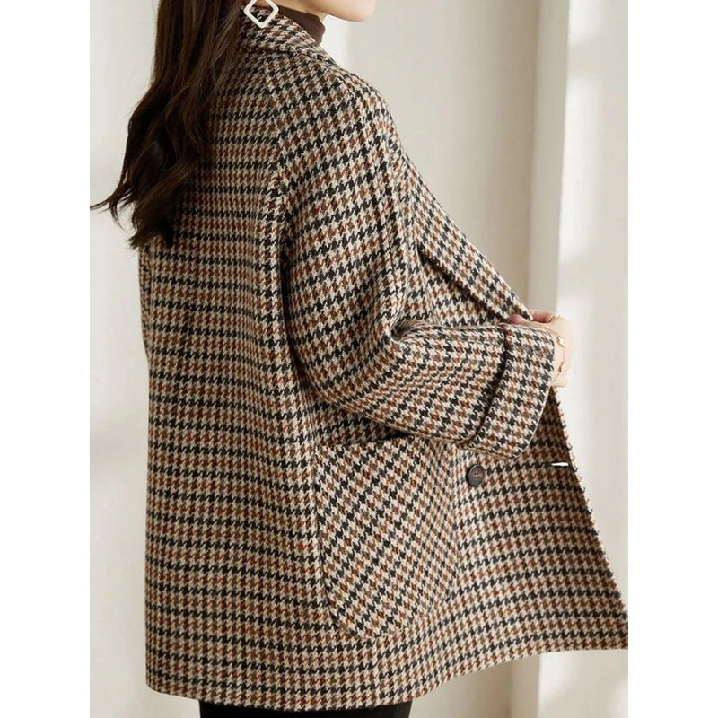 This women’s blazer showcases a classic patterned fabric with a defined silhouette. The notched lapels and double-button front create a refined shape suited to both work and informal settings. Its longline cut offers balanced coverage and a contemporary outline.