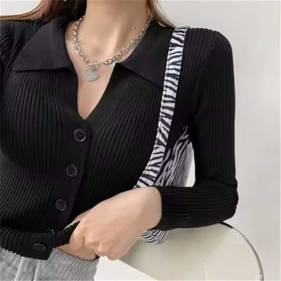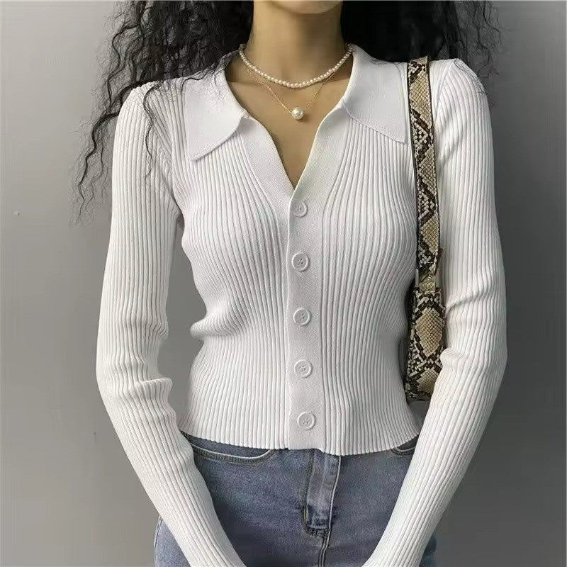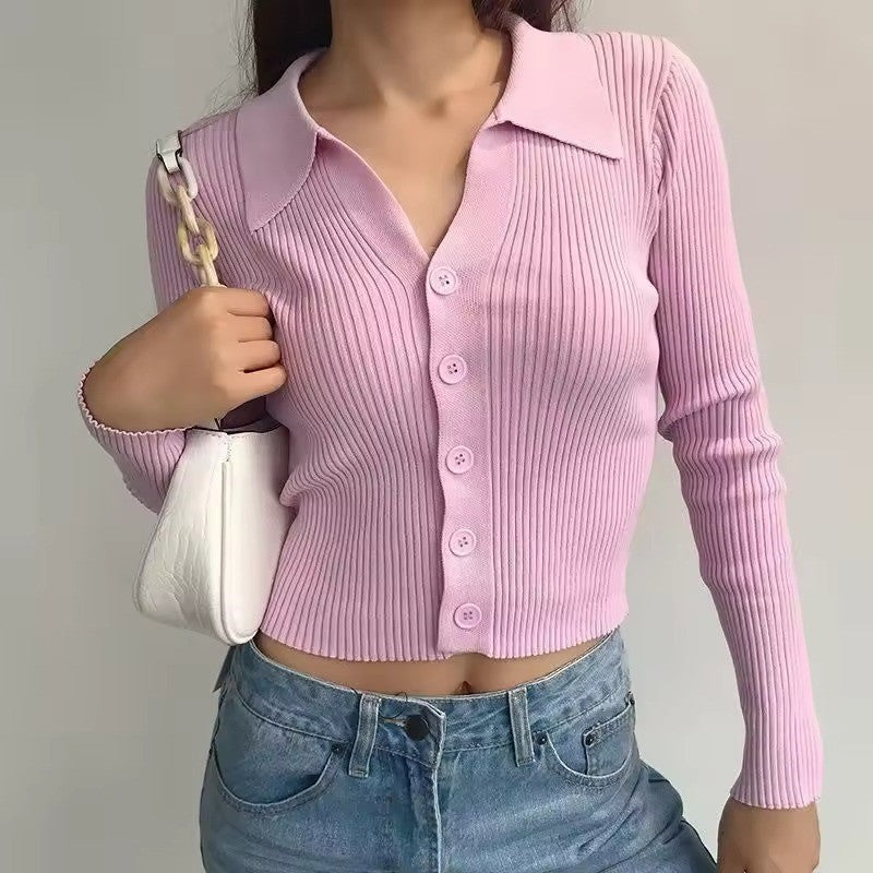 Women’s Knitted Crop Top Button Top with Long Sleeves