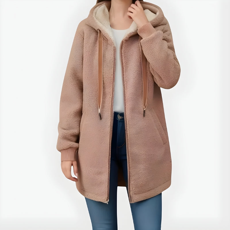 This women’s long hooded coat pairs a textured outer surface with a relaxed fit suitable for layering. A full zip closure and drawstring hood allow for adjustable coverage in cooler conditions. Ribbed cuffs keep the sleeves neatly in place, while two front pockets add practical function to the overall design.
