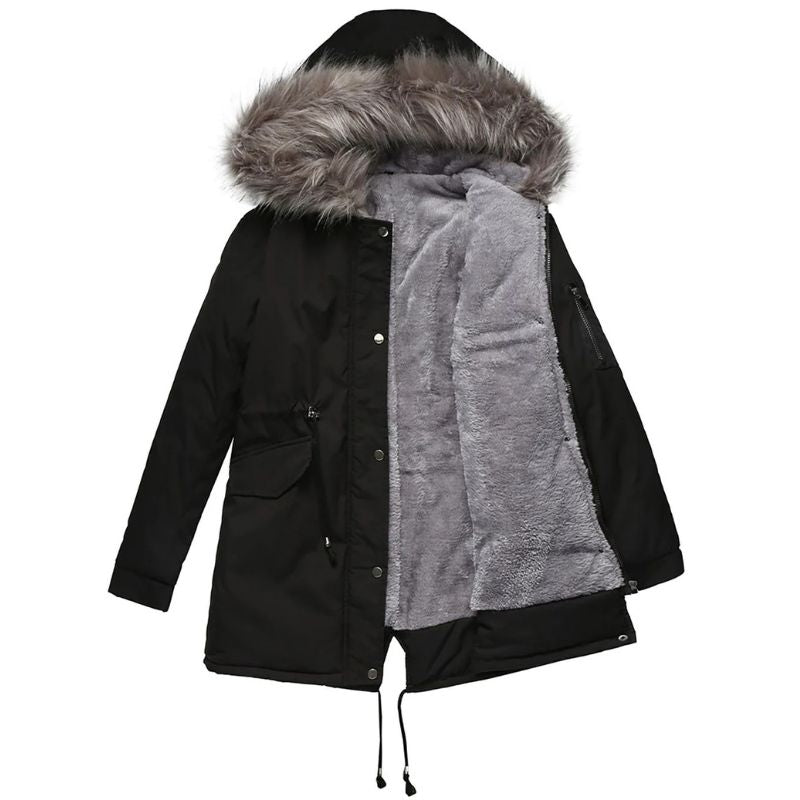 A full-length winter parka with a hood trimmed in faux fur and a straight hem. The body is lined with polyester sherpa to help retain warmth on cold days, while the exterior keeps a clean, city-ready silhouette. Practical pockets hold daily essentials for commutes, errands, and winter trips.
