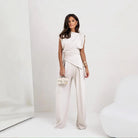 Design: Off-shoulder top with asymmetrical cut and wide-leg trousers.