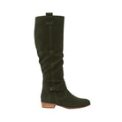 These tall boots present a soft gathered shaft reaching below the knee, shaped with a rounded toe and supported by a low block heel. A slim strap with metallic accent adds structure to the upper part. The design allows balanced proportions when worn with skirts or fitted trousers.