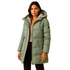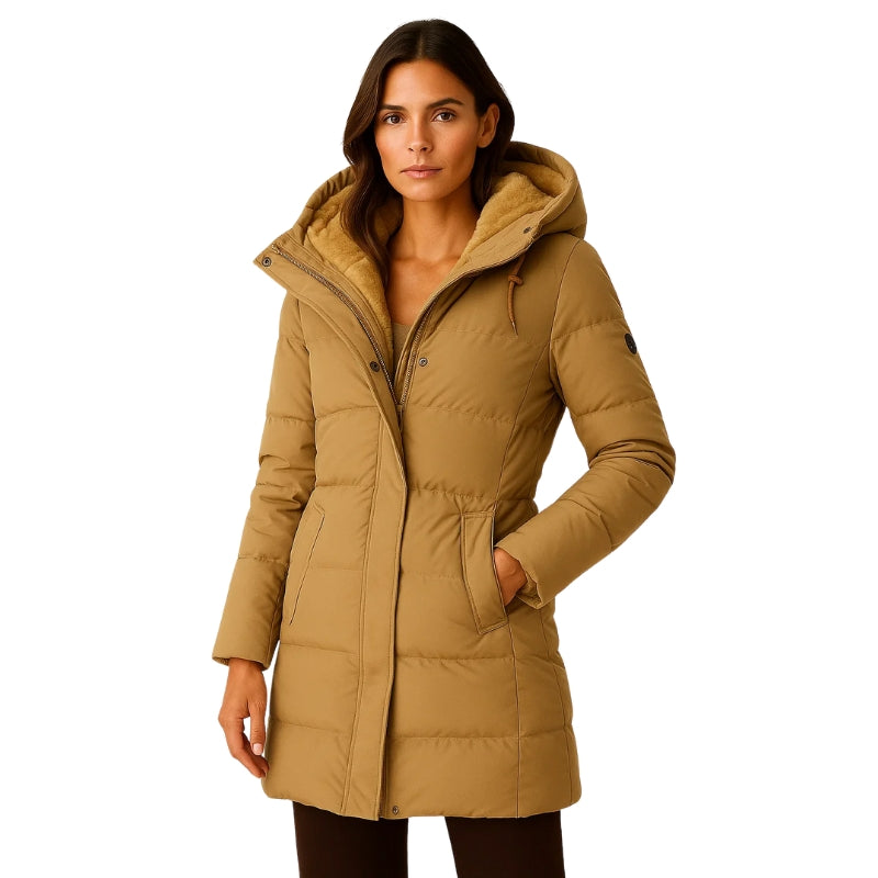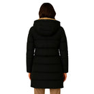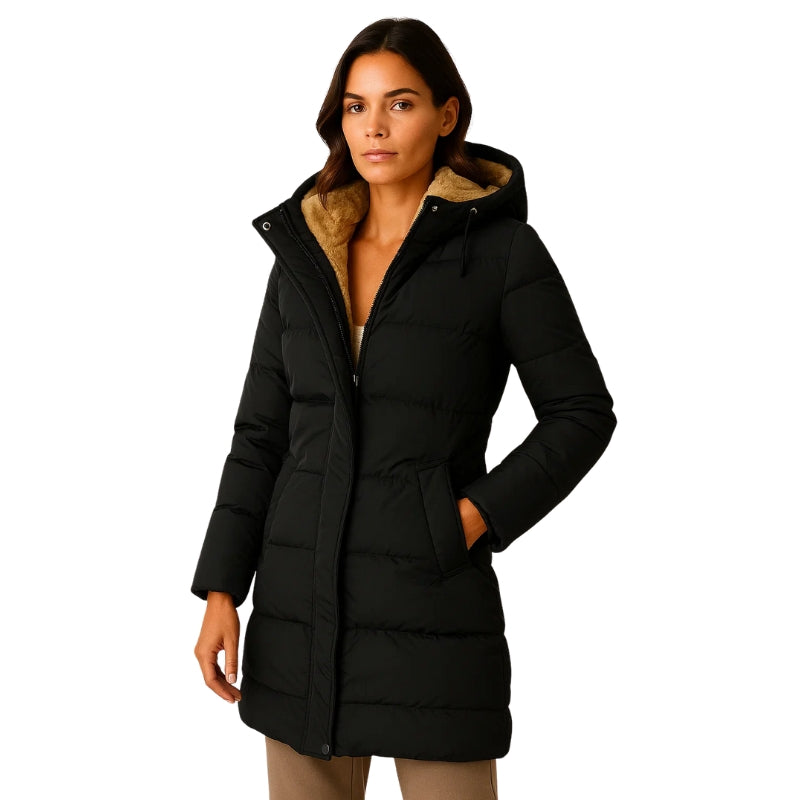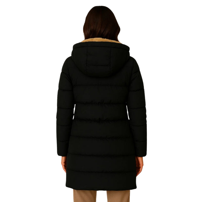 This long padded coat provides full coverage and insulation for colder days. full front zip with snap fasteners a secure closure, and the hood adds an extra layer of coverage. The practical side pockets are positioned for convenience and subtle design, creating a neat finish for any day out.