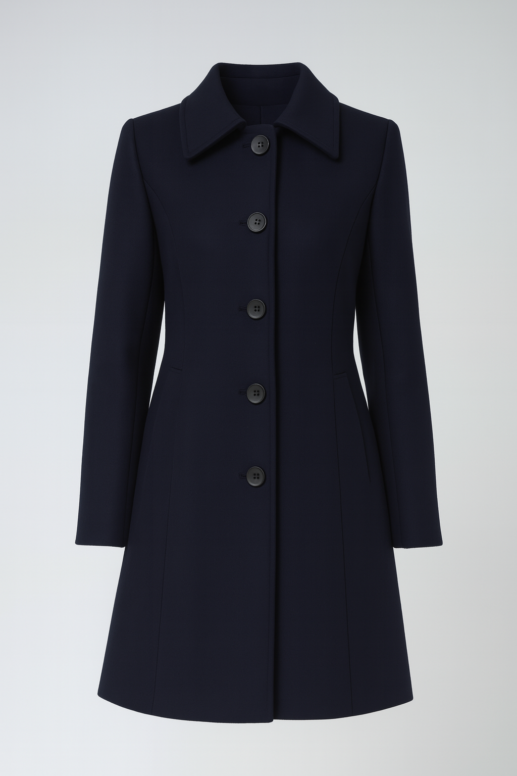 A button-front coat with a shaped waist and a flared hem, made to sit neatly over everyday clothes. The design is clean with a classic collar and neat seam lines that create a silhouette. Wear it for work, meetings or after-hours plans.