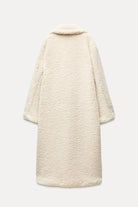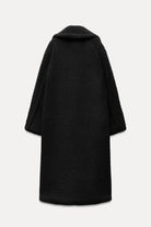 This women's long coat presents an appealingly fluffy exterior texture, offering a layering piece for the colder seasons. It is shaped with a classic lapel collar and an extended cut for ample coverage and a commanding silhouette. The design includes front side pockets for practicality and a central button closure.Â