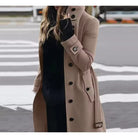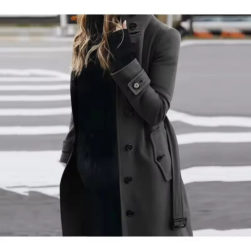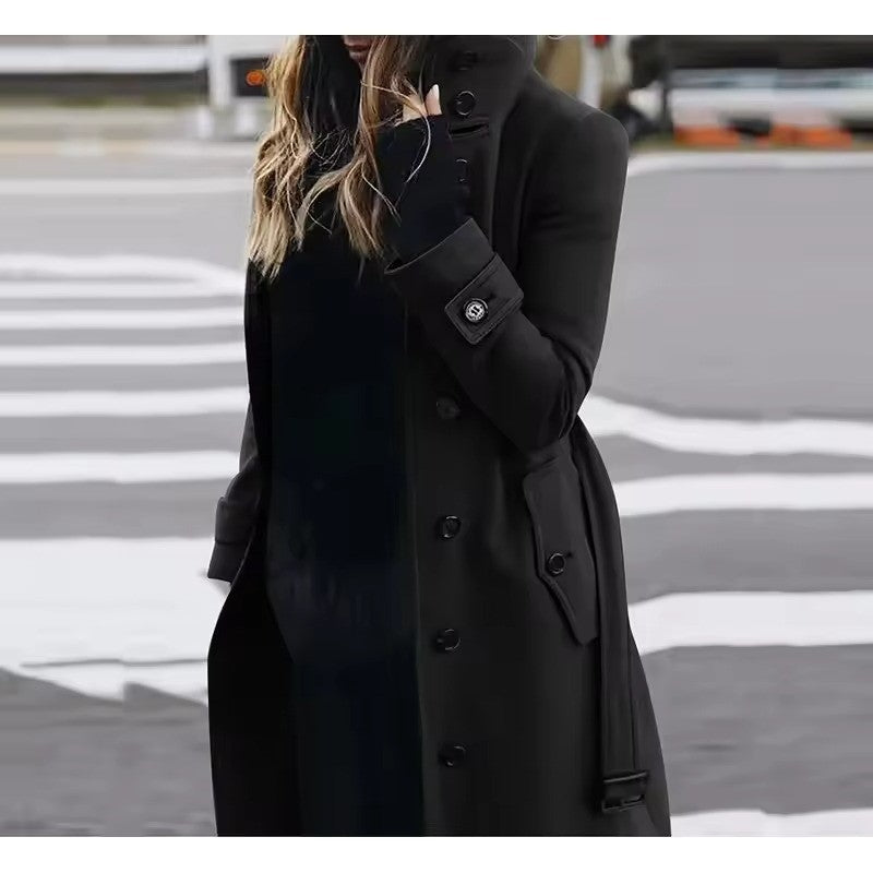 This women's long coat offers a prominent high neck and a full button placket with maximum coverage against the cold. A matching waist tie allows you to cinch the middle, creating a sharply shape. With its practical length and buttoned details on the cuffs and pockets, this coat is an indispensable item for winter dressing.