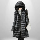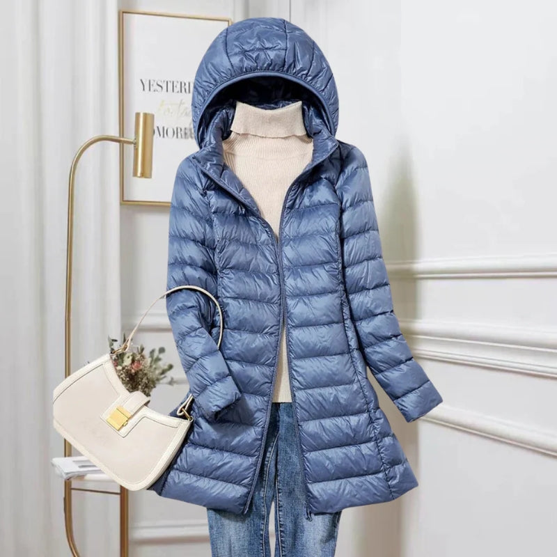 This women’s puffer jacket presents a quilted surface that balances structure and warmth. The hood provides additional coverage, and the front zipper runs through the full length for layering over inner garments. Its long cut keeps proportions clean while supporting an elegant winter silhouette.