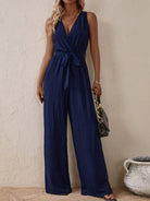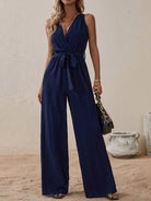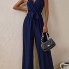 Women's Navy V-Neck Jumpsuit – Belted Wide Leg Summer Occasion Wear