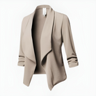 This women's topcoat is an item meant to be worn over other clothing for an additional layer. It has a collar with folds (lapels) and long sleeves that can be adjusted on the arm. The front of the jacket remains open, letting the fabric fall naturally over an inner top or dress. This jacket is a suitable item for work settings, occasions where formal dress is required, or for improving a basic set of clothes. The shape of the jacket helps to create a straight and organised appearance as the final piece of an ensemble.