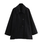 This women's coat is an overcoat-length suitable for cooler temperatures. It has a classic lapel collar and is cut with a defined silhouette across the body. This outerwear piece is appropriate for wearing during the autumn, winter, and spring seasons, functioning as a layer over clothing for formal occasions.