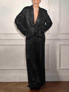 The sequinned blazer is designed with a loose silhouette and a smooth fabric base. The surface is covered in sequins that create texture and light reflection, while the shape allows layering over different garments.