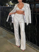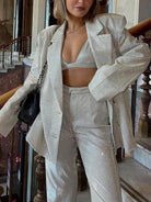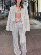 The long-sleeve blazer has a relaxed shape with a lapel neckline and a surface finished with subtle sequins. The design allows layering and can be styled for different occasions.