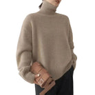 A roomy knit with a tall fold-over turtleneck and a straight hem. Ribbing frames the collar, cuffs, and hem for a tidy profile, while the beige tone keeps styling straightforward. The longer cuffs can cover part of the hands on cold mornings. Suitable for office days, at-home plans, and city evenings in cooler weather.
