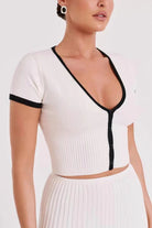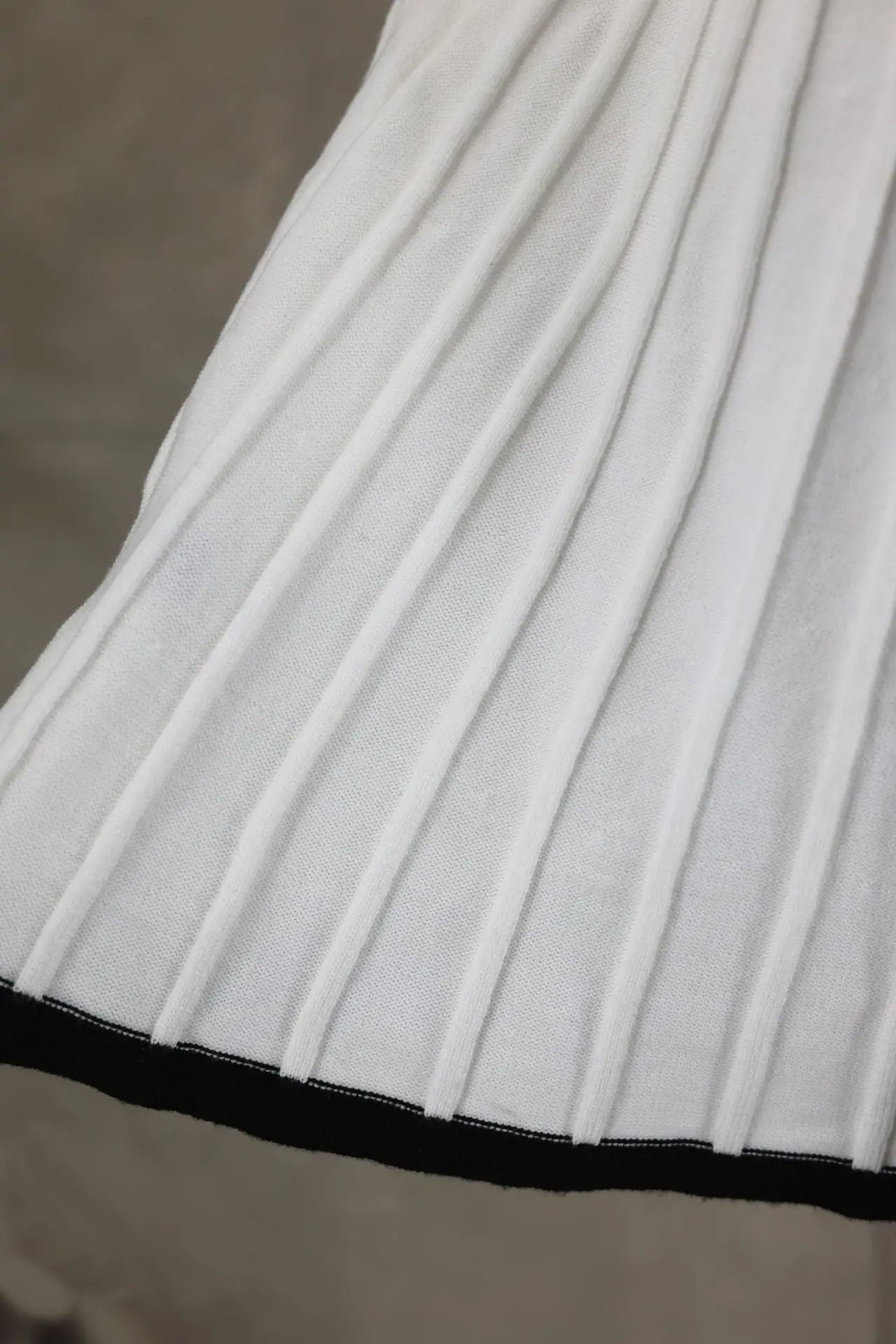 - Design: Slim-fit top with button details and a flowing pleated skirt