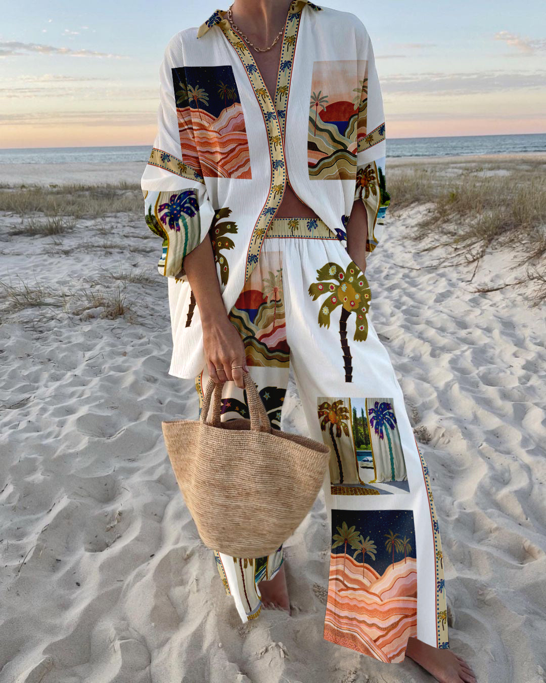 - Design: Open collar blouse with colorful print, ankle-length trousers with elasticated waistband