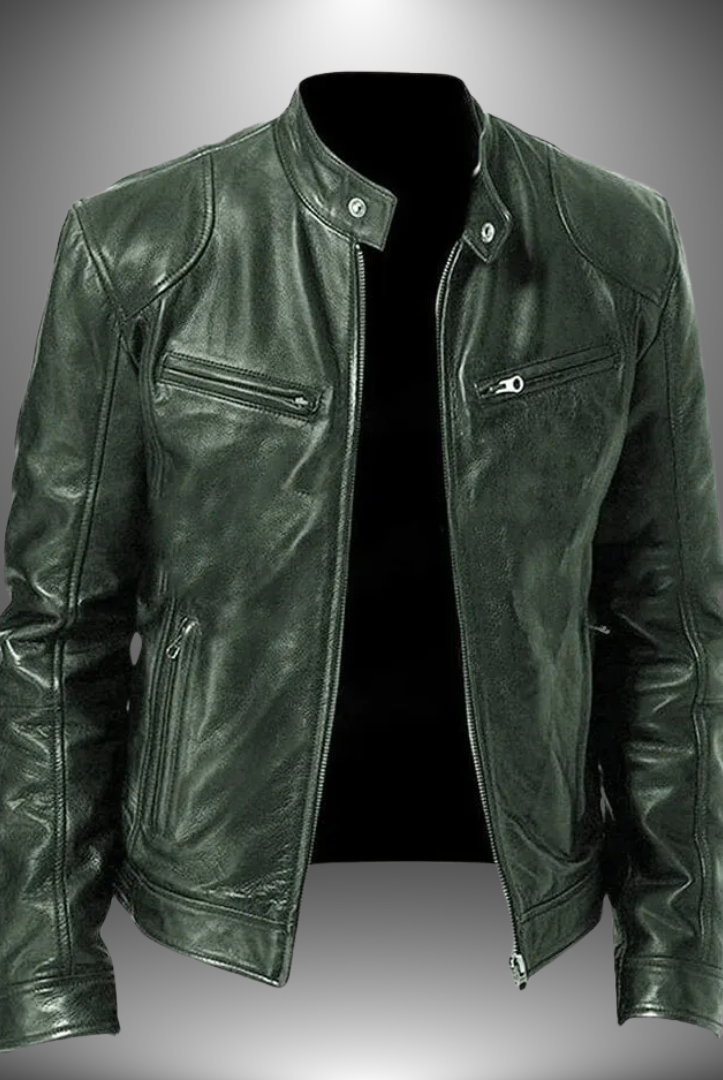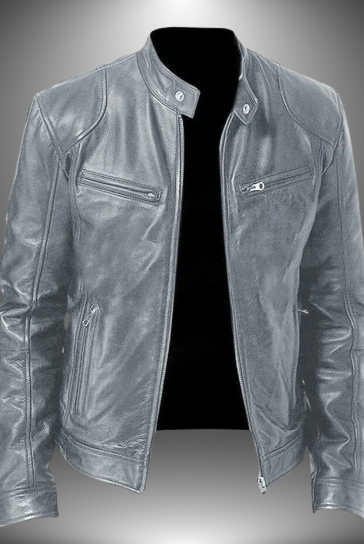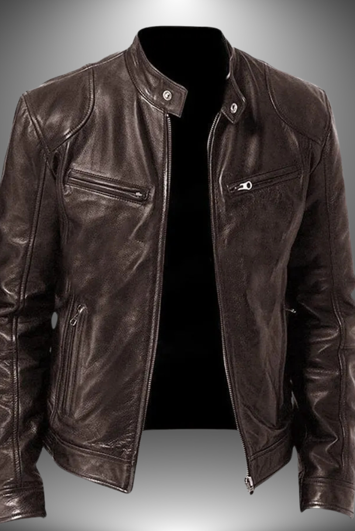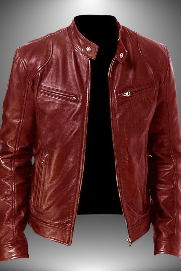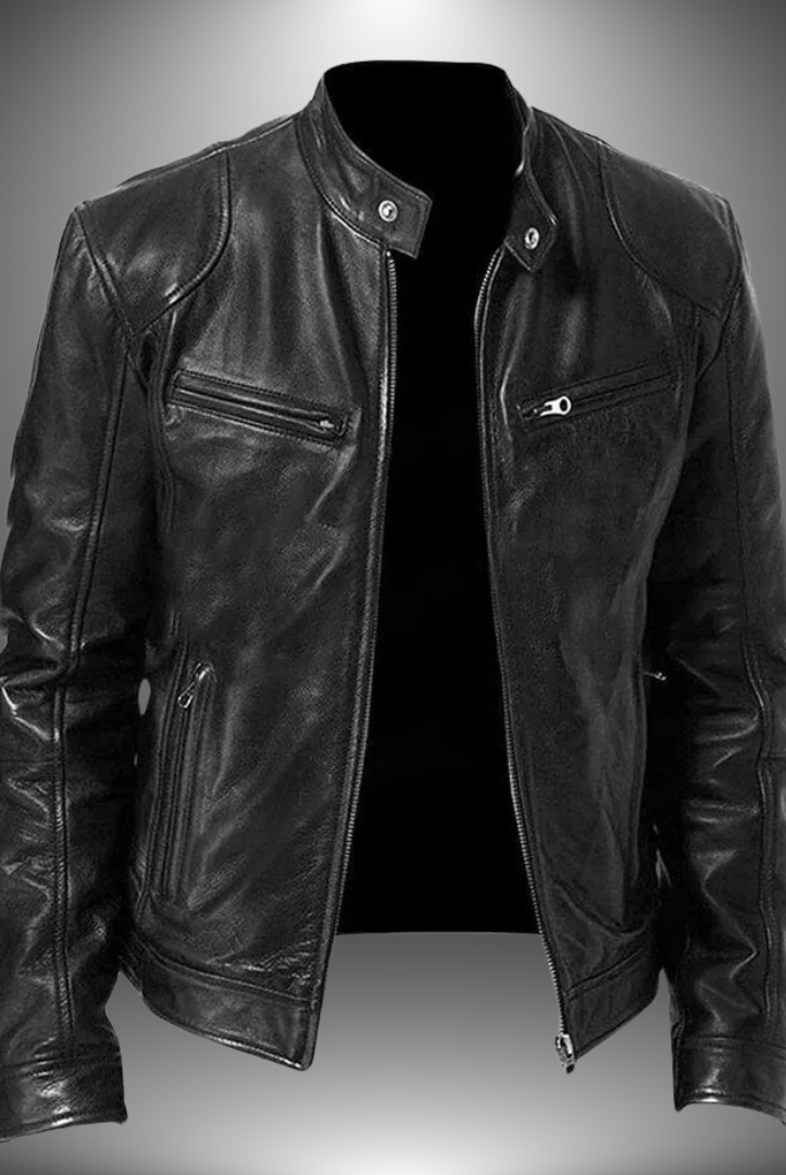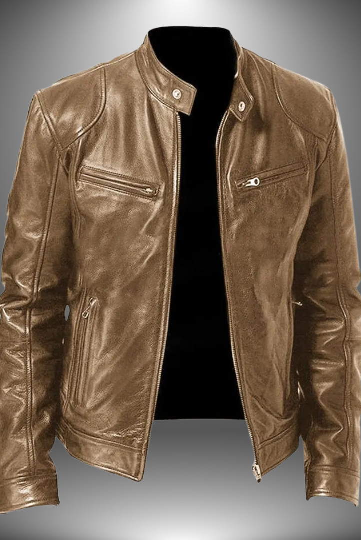 Men’s Leather Biker Jacket – Zip-Up with Stand Collar and Pockets