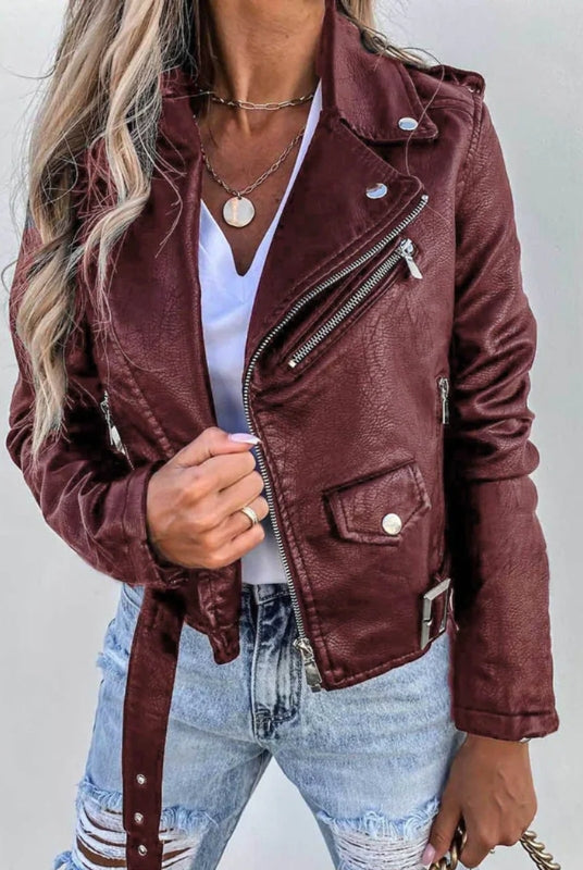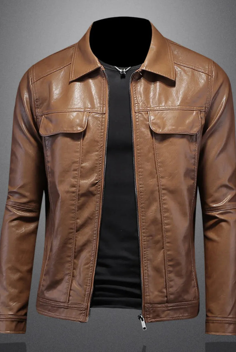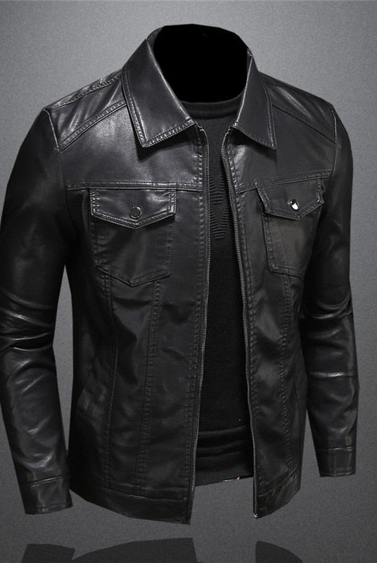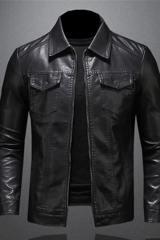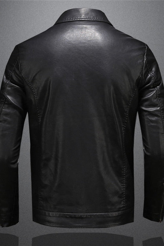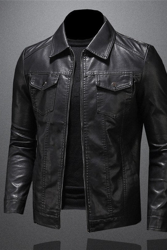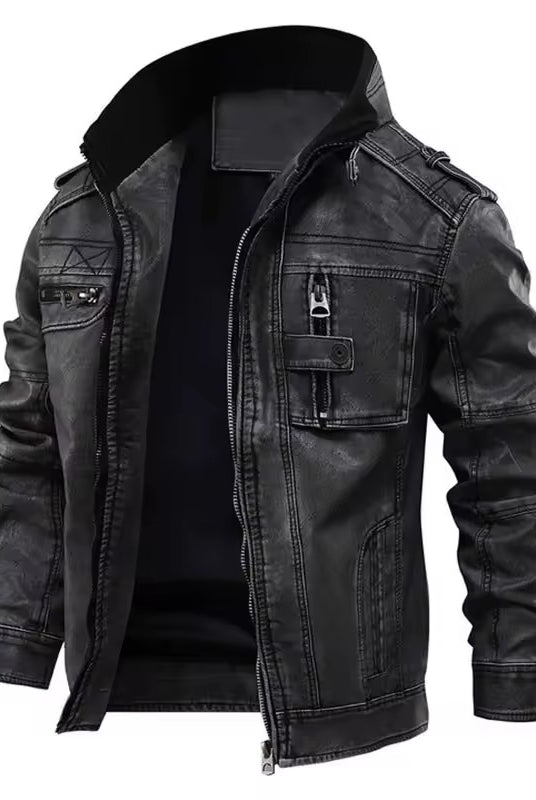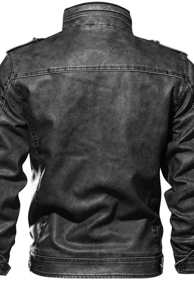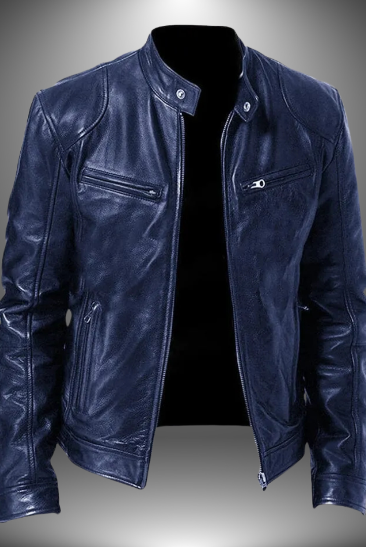 Men’s Leather Biker Jacket – Zip-Up with Stand Collar and Pockets